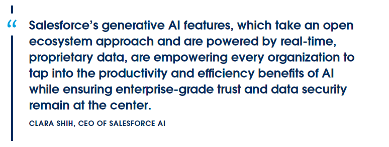 - “Salesforce’s generative AI features, which take an open ecosystem approach and are powered by real-time, proprietary data, are empowering every organization to tap into the productivity and efficiency benefits of AI while ensuring enterprise-grade trust and data security remain at the center.” — Clara Shih, CEO of Salesforce AI